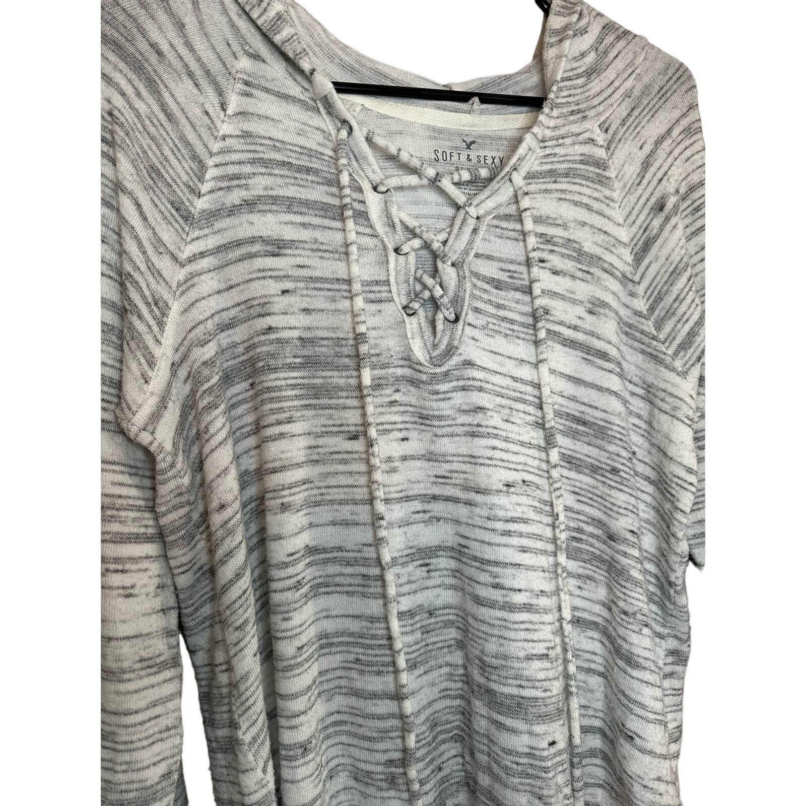 American Eagle Plush Soft Lace Up Long Sleeve Hooded Grey White Size M