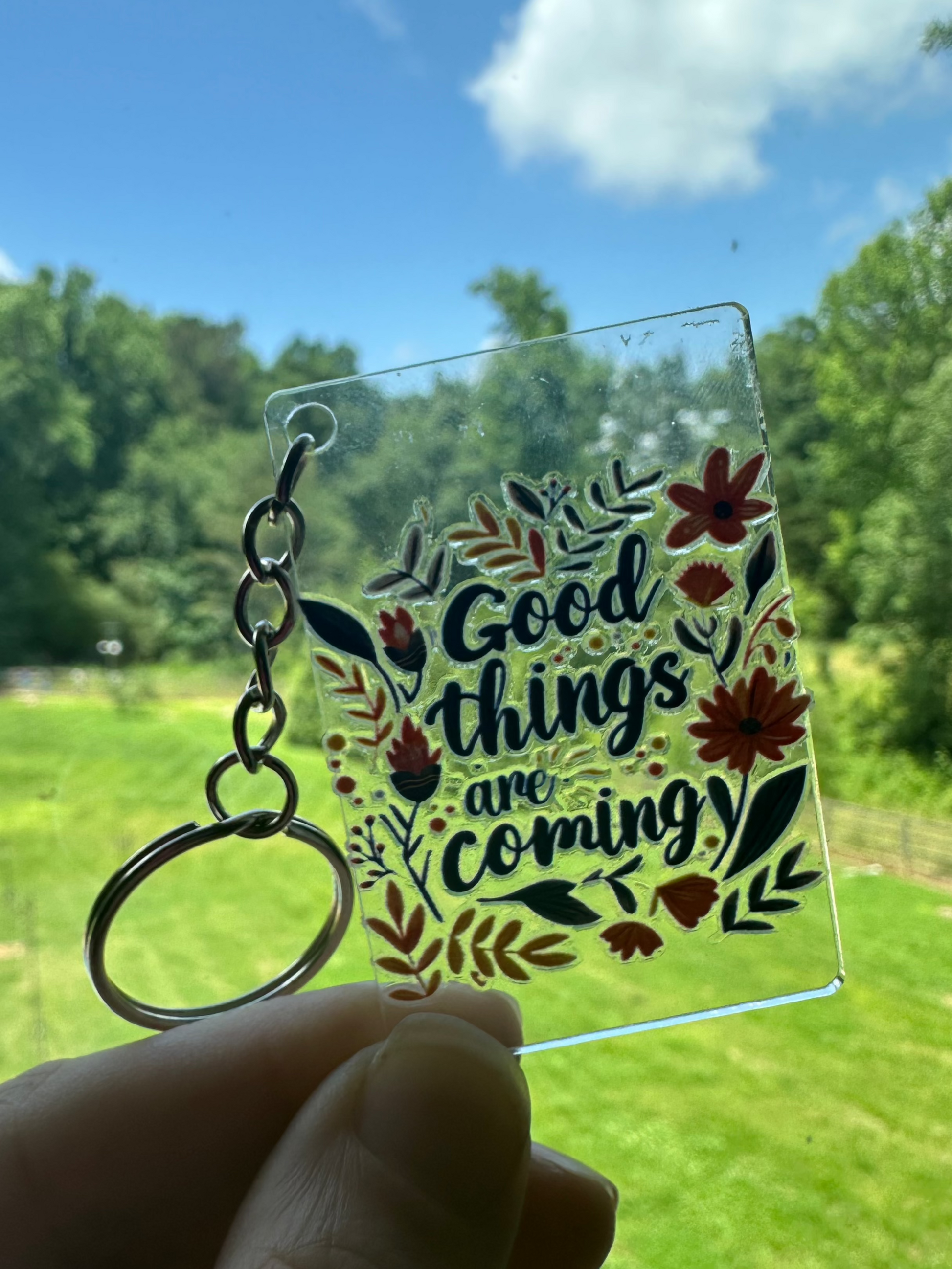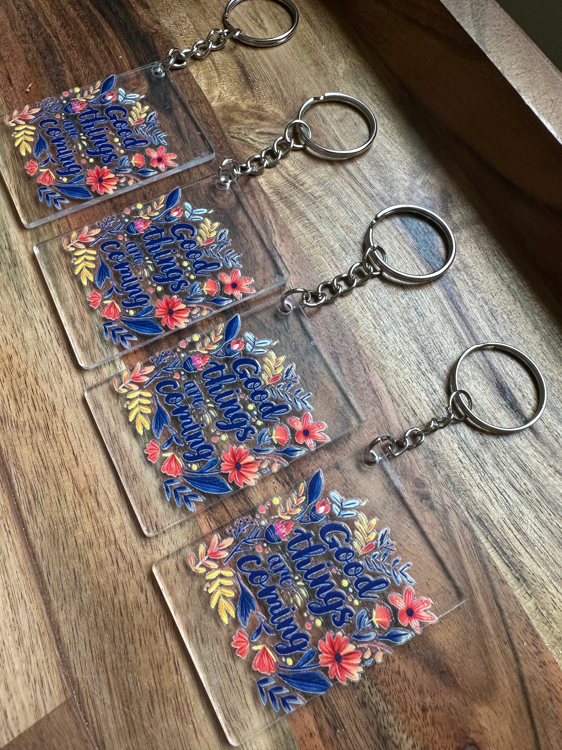 Clear Acrylic Keychain- 'Good Things Are Coming' Floral Print Postivity Keychain