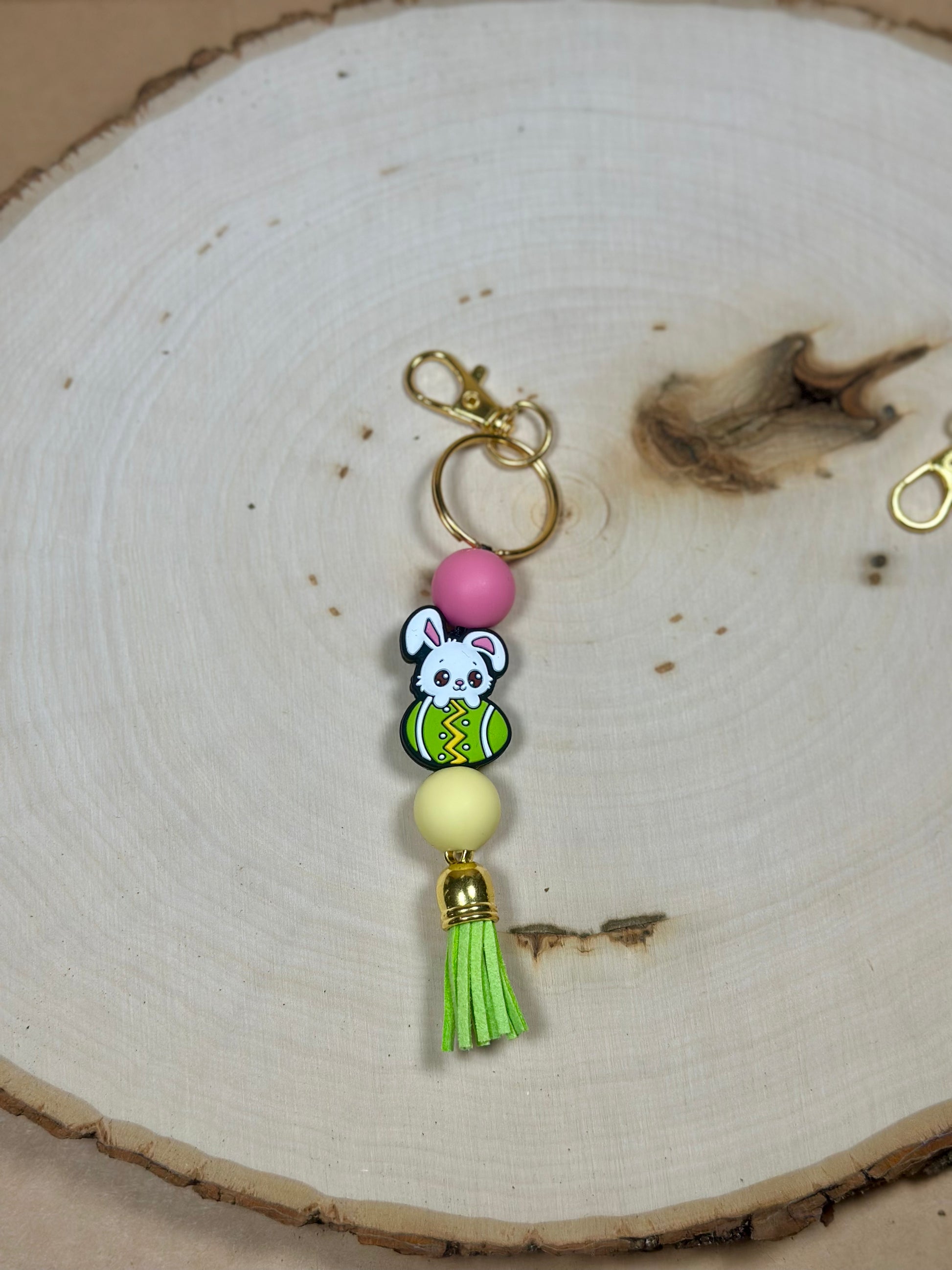 Bead Colors/Design: Pink, yellow, Easter bunny popping out of Easter egg focal bead, and a green tassel at the bottom
