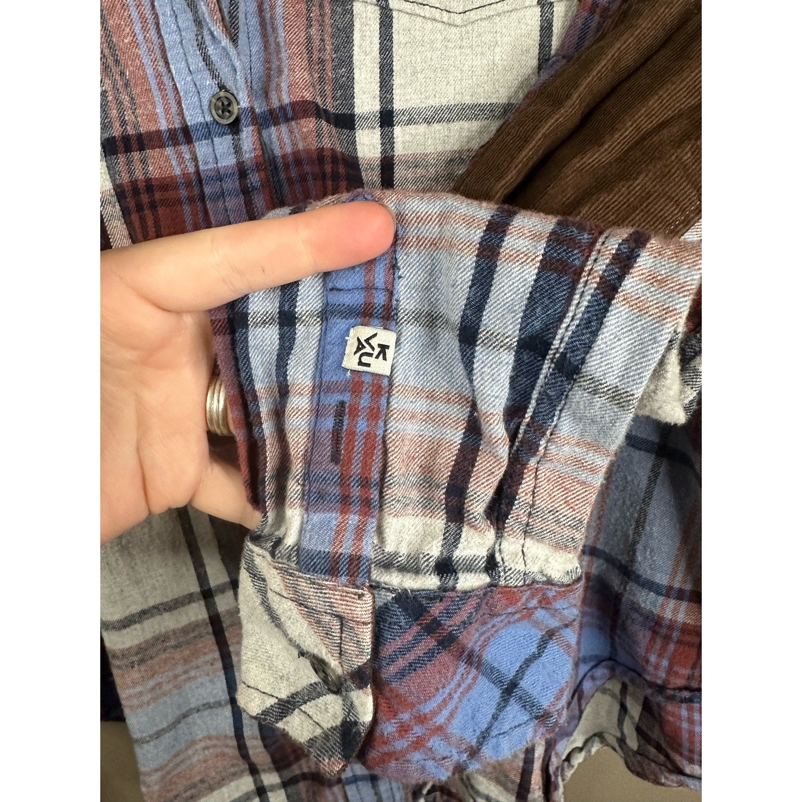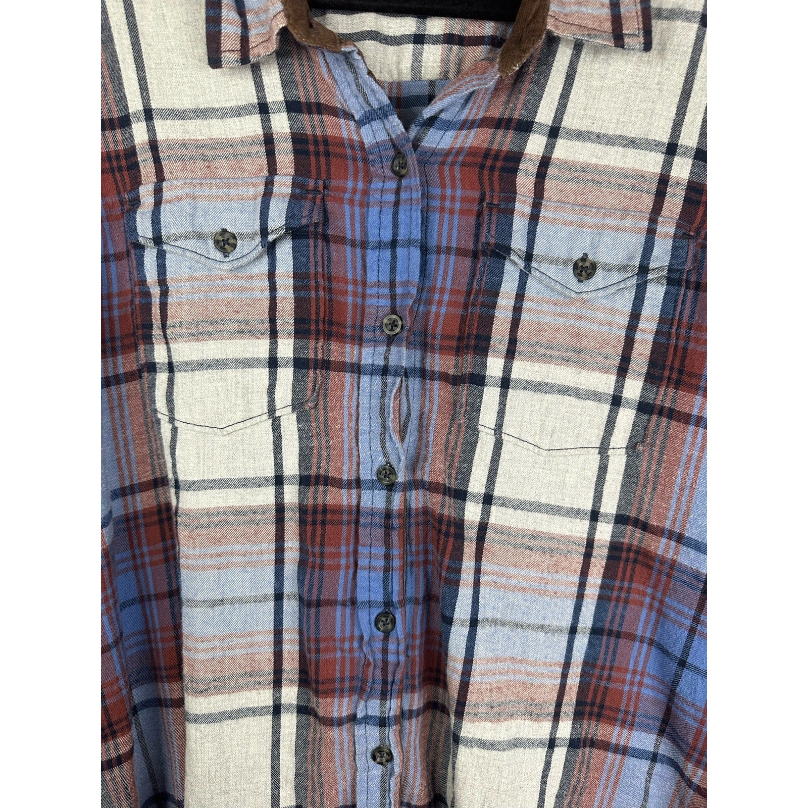 Men’s Kavu is Long Sleeve Blue Brown Plaid Elbow Patch Button Down Size Large