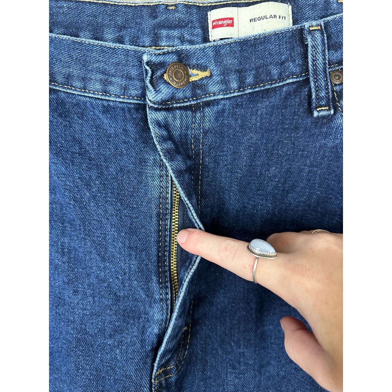 Unleash your inner cowboy with these durable and stylish jeans! Made with high-quality denim, these Wrangler jeans provide a comfortable fit and a classic medium/dark wash. The regular fit ensures that you'll have plenty of room to move and stay comfortable all day long. With a size of 42x30, these jeans are perfect for any man looking for a versatile and reliable pair of pants. Don't settle for anything less than these Wrangler jeans that will keep you looking and feeling your best.