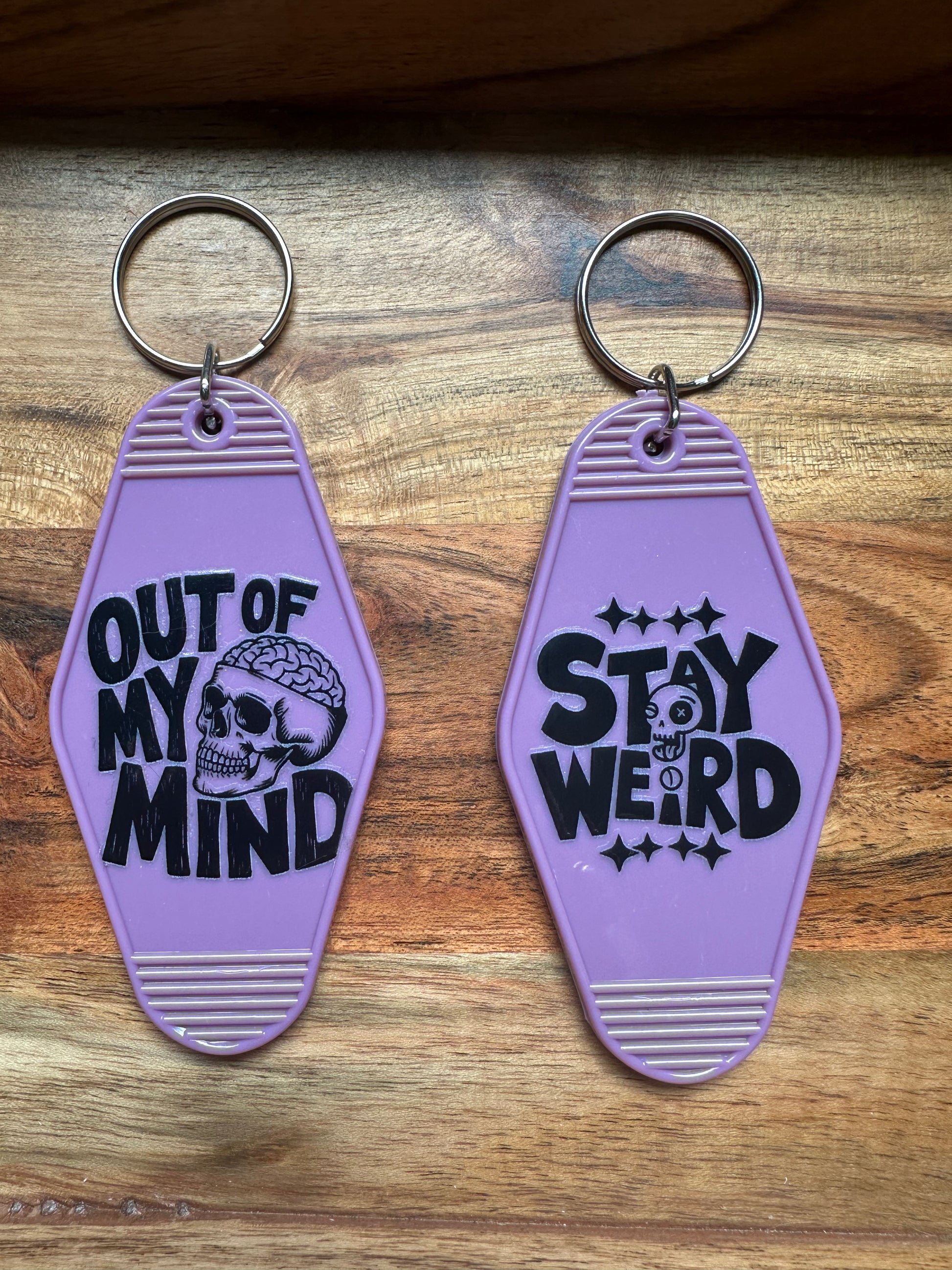 ✨Celebrate your unique style with this vibrant purple motel keychain featuring a playful skeleton design. The front boldly displays the phrase "stay weird," encouraging you to embrace your individuality every day. Flip it over to find the quirky message "out of my mind," adding a touch of humor and personality to your keys or bag. Made from durable plastic, this keychain is lightweight yet sturdy, perfect for keeping your keys organized while making a statement. Whether for yourself or as a gift, this accessory is a fun reminder to stay true to your one-of-a-kind spirit.