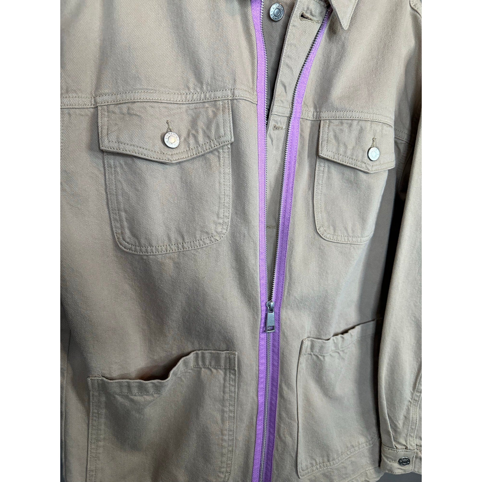 - color: tan/ khaki with light purple/ lilac zipper in the middle
