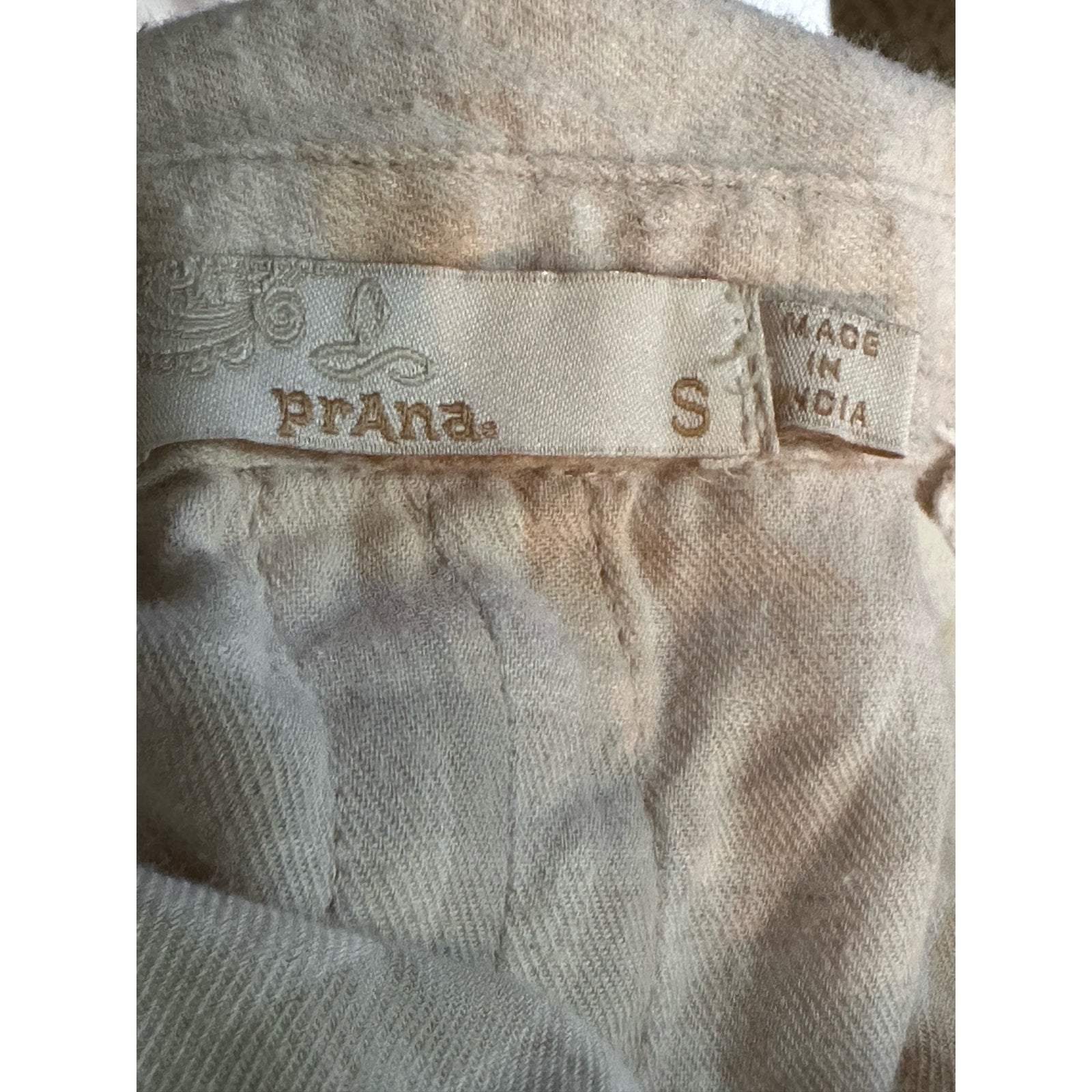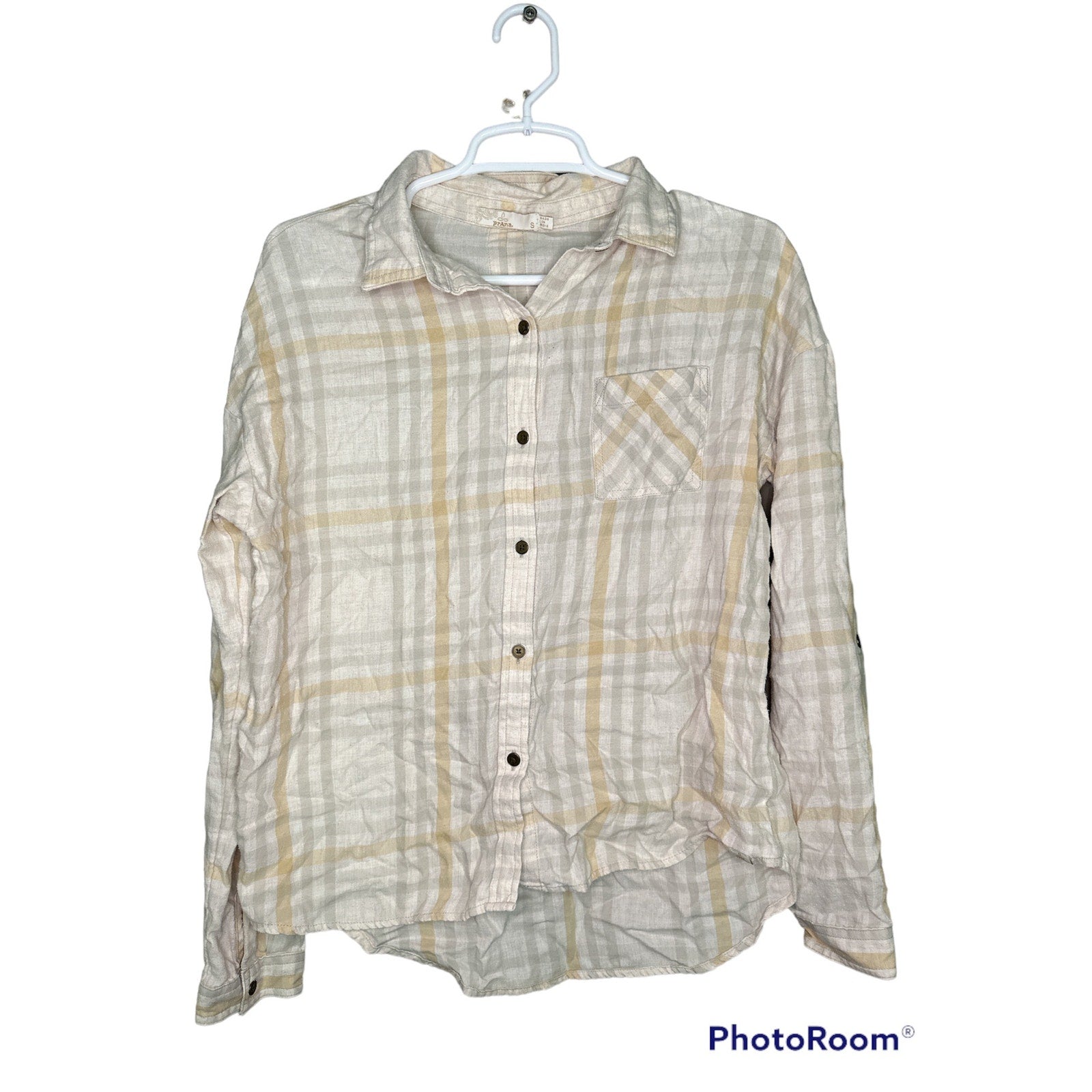 PrAna Long Sleeve Plaid Pattern Button Down Beige Brown Cream Flannel Size Small
