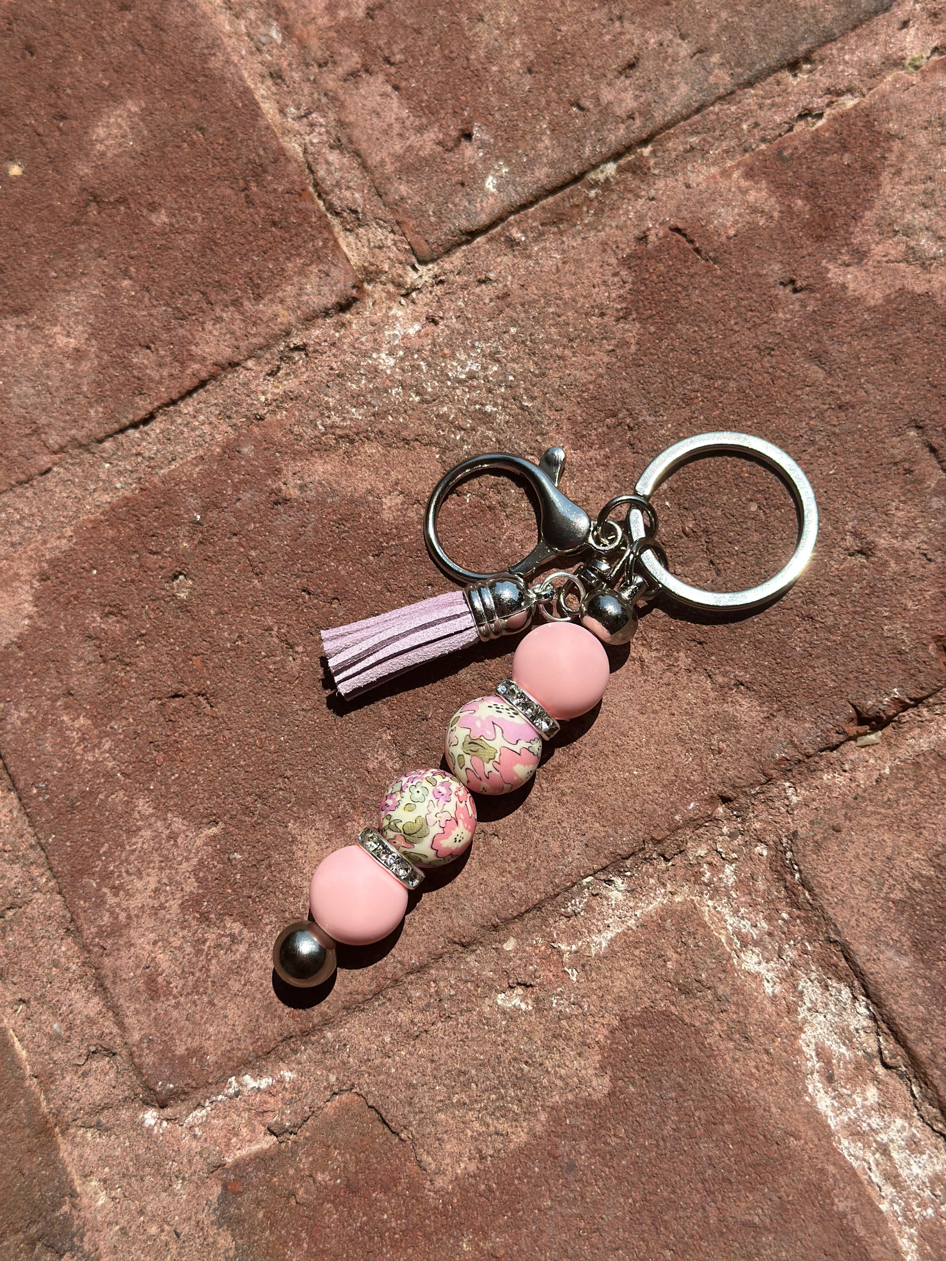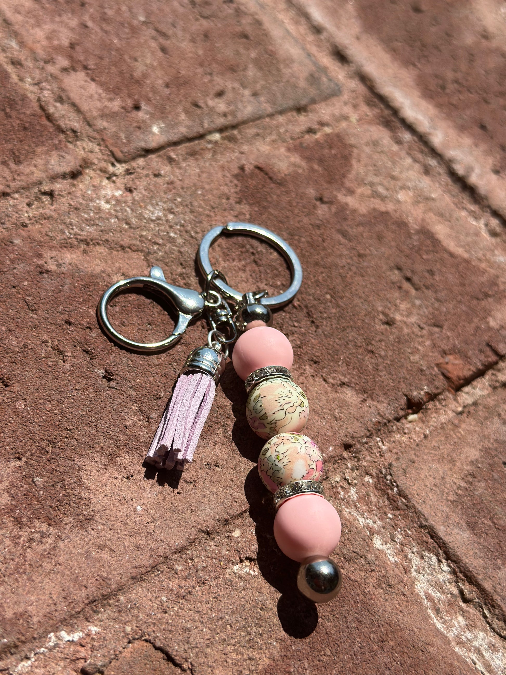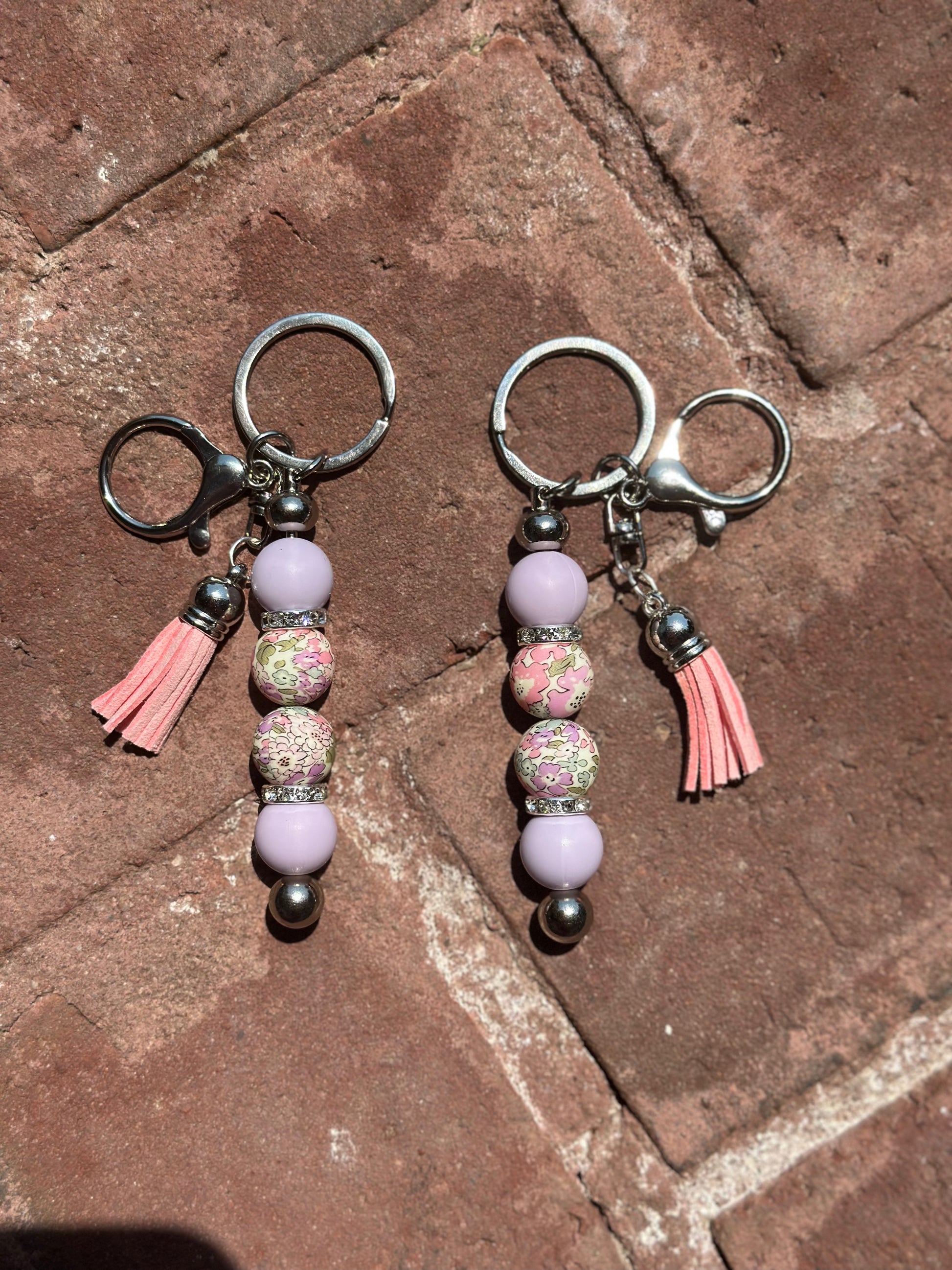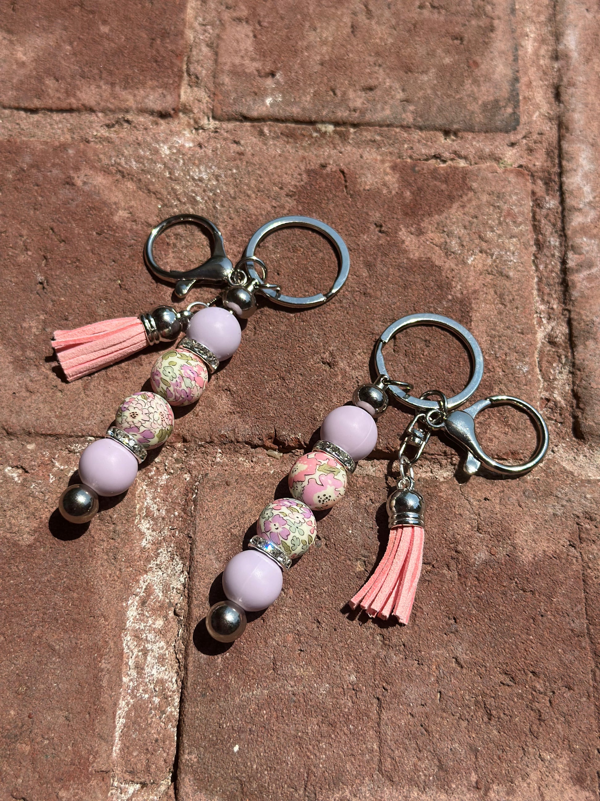 This keychain features a silver key ring and lobster clip, available in two styles: one with purple spacers, a pink and green floral bead, and a pink tassel; the other with pink silicone beads, purple spacers, a floral bead, and a purple tassel. Both offer a stylish way to keep your keys secure and easy to find.