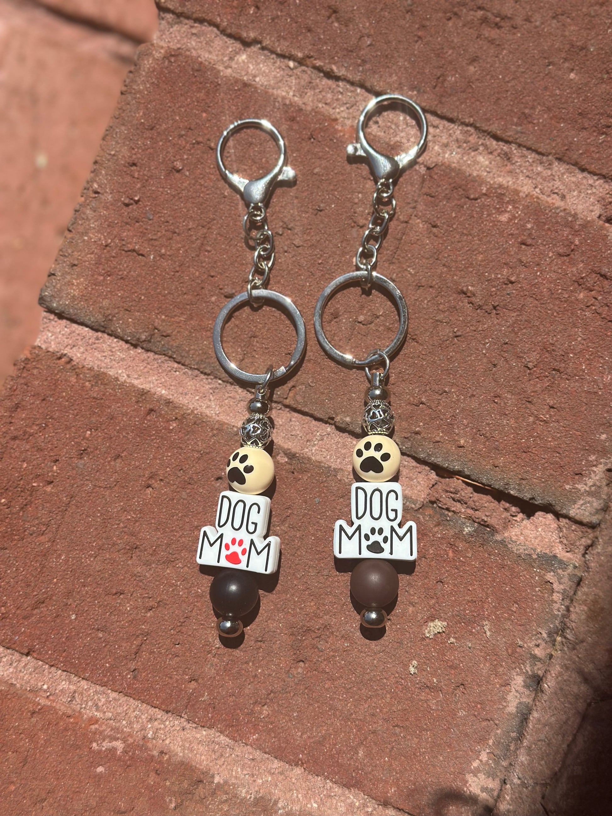 This silver keychain includes a sturdy key ring, a lobster clip for easy attachment, and a silver post adorned with a beige paw print bead. The centerpiece is a colorful "Dog Mom" silicone bead, complemented by a brown silicone bead at the bottom. Designed for dog lovers, it combines practicality with a charming, personalized touch.