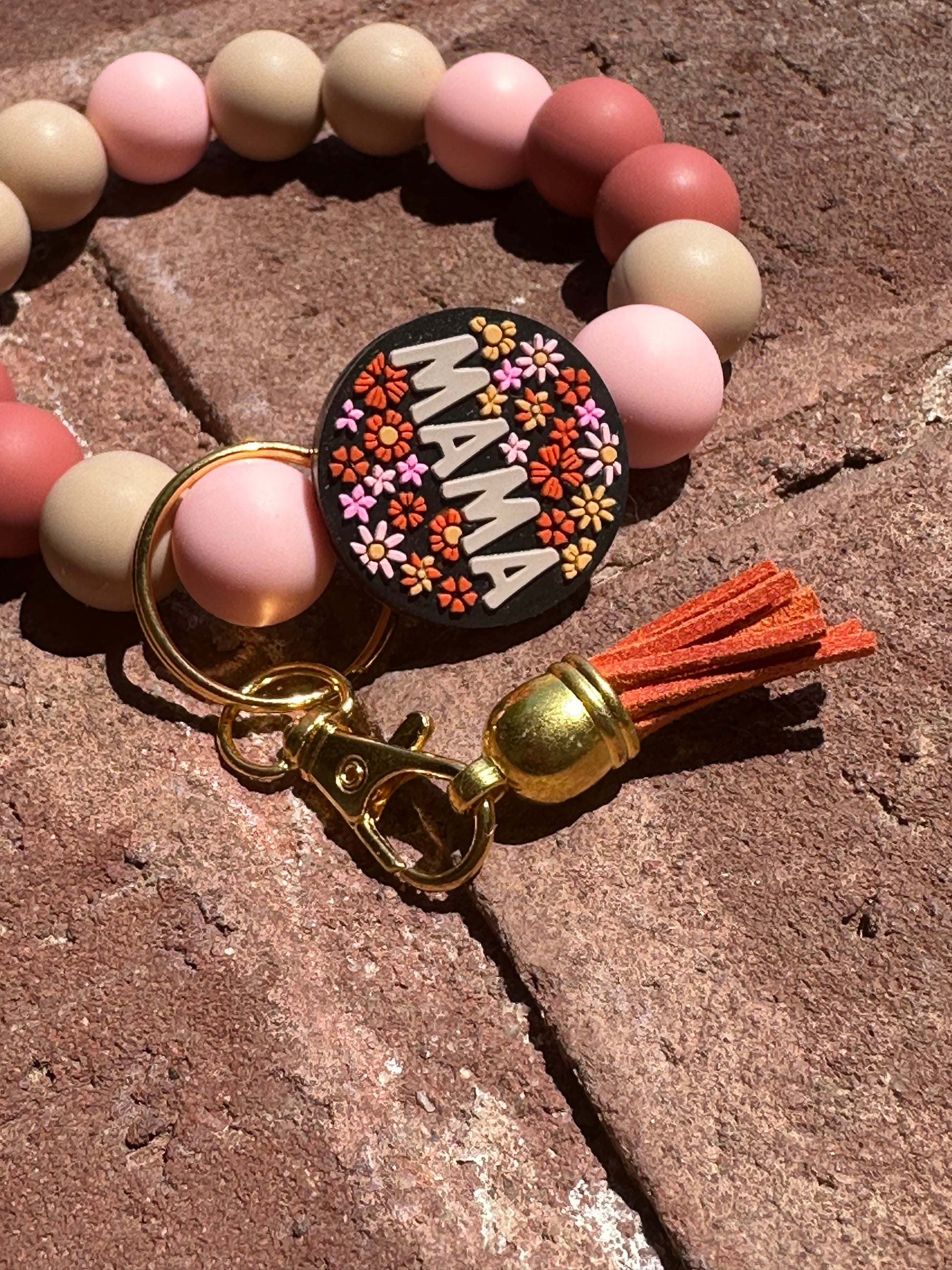 Silicone Beaded Wristlet Keychain | Floral 'Mama' Beige, Rust Light Pink