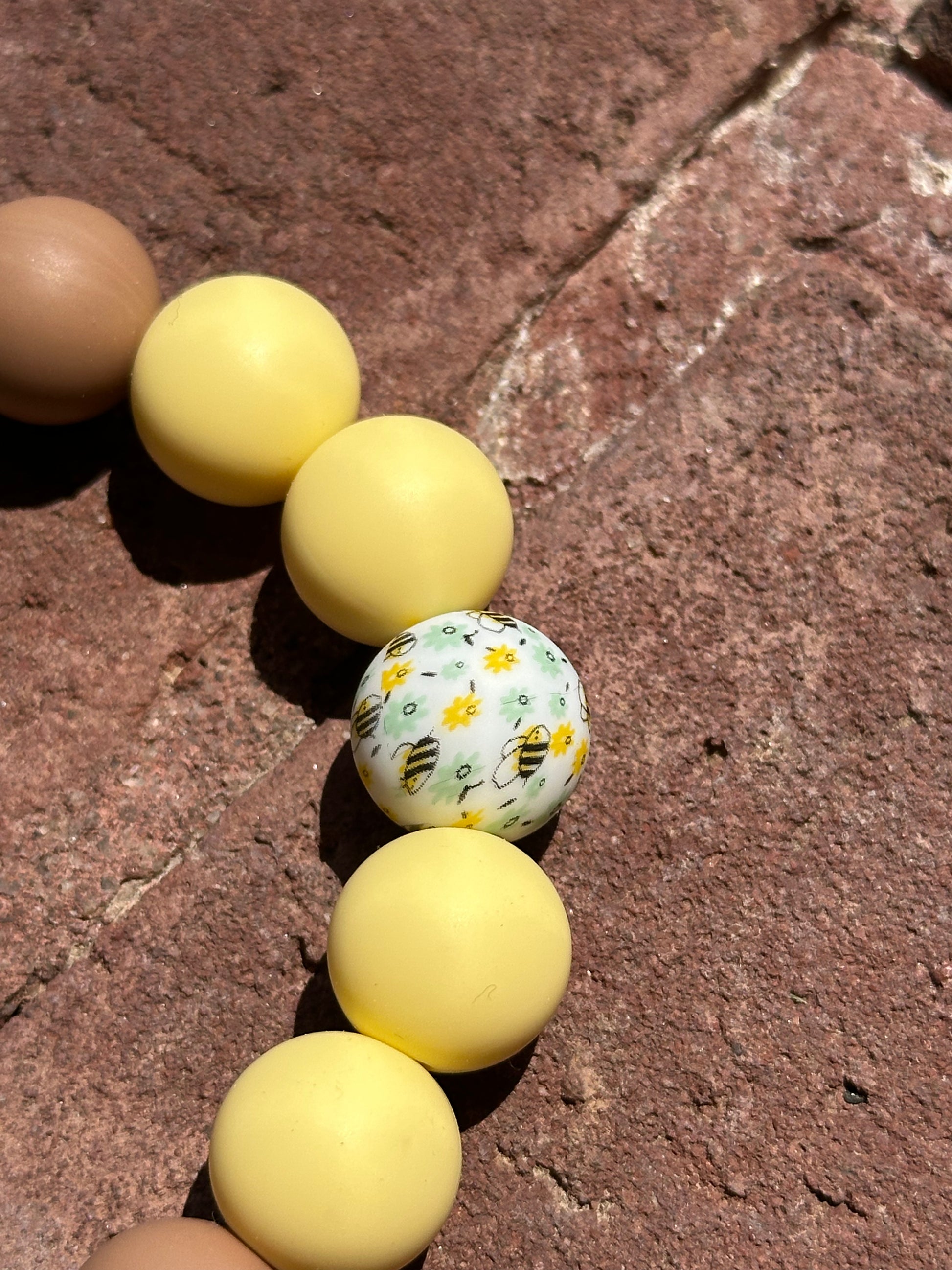 Focal Bead: Focal bead is a white printed bead with bees printed on it.