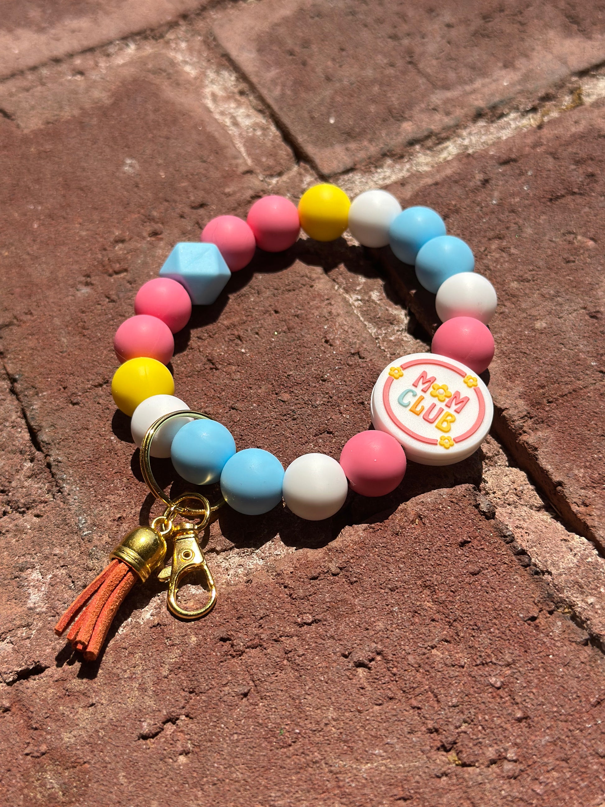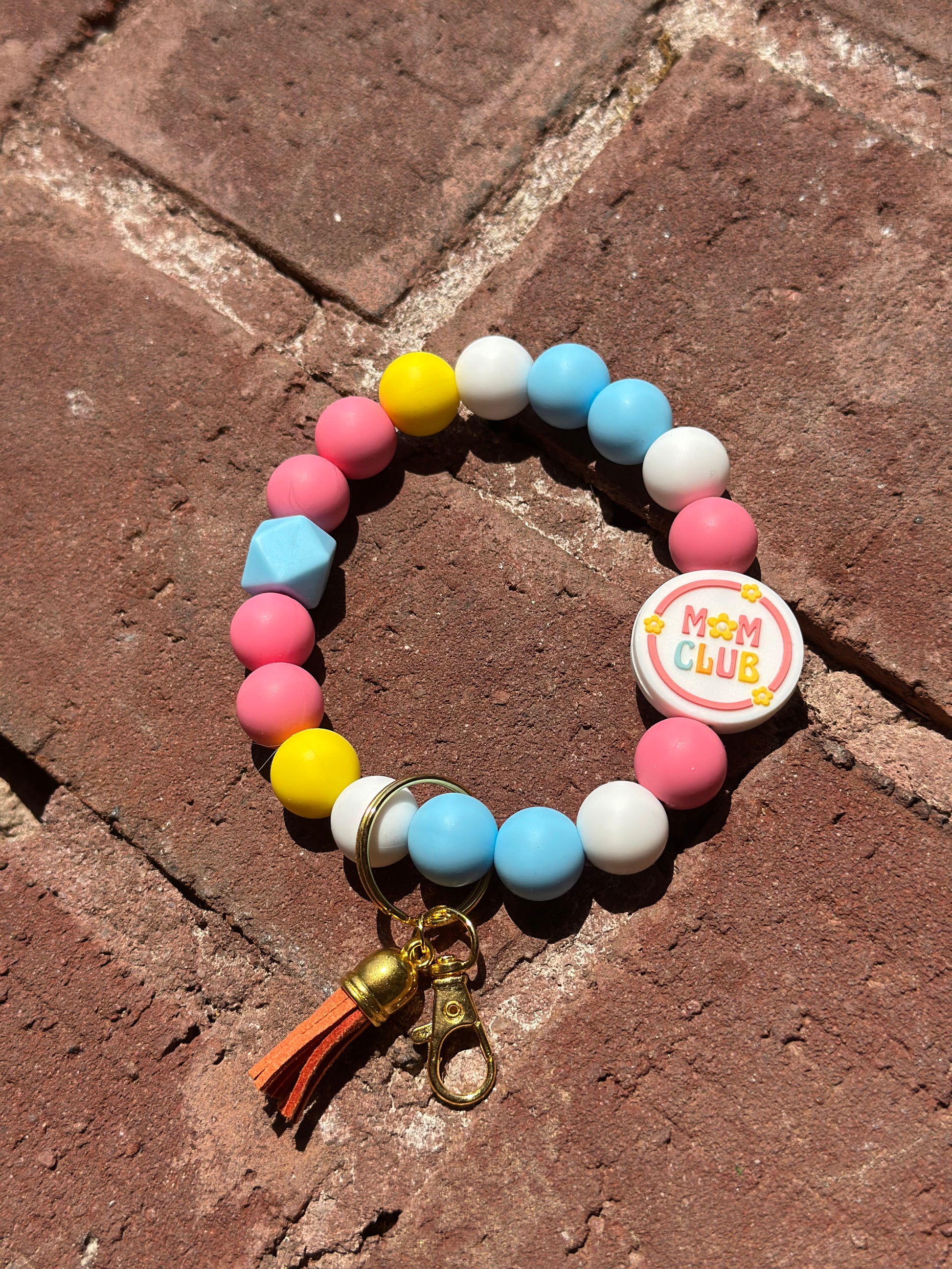 This wristlet keychain features gold hardware with a key ring and lobster clip for secure attachment. It includes a standout "Mom Club" bead surrounded by silicone beads in light blue, yellow, pink, and white. Designed to be both functional and stylish, it offers a convenient way to carry your keys while showing off a fun, supportive message.