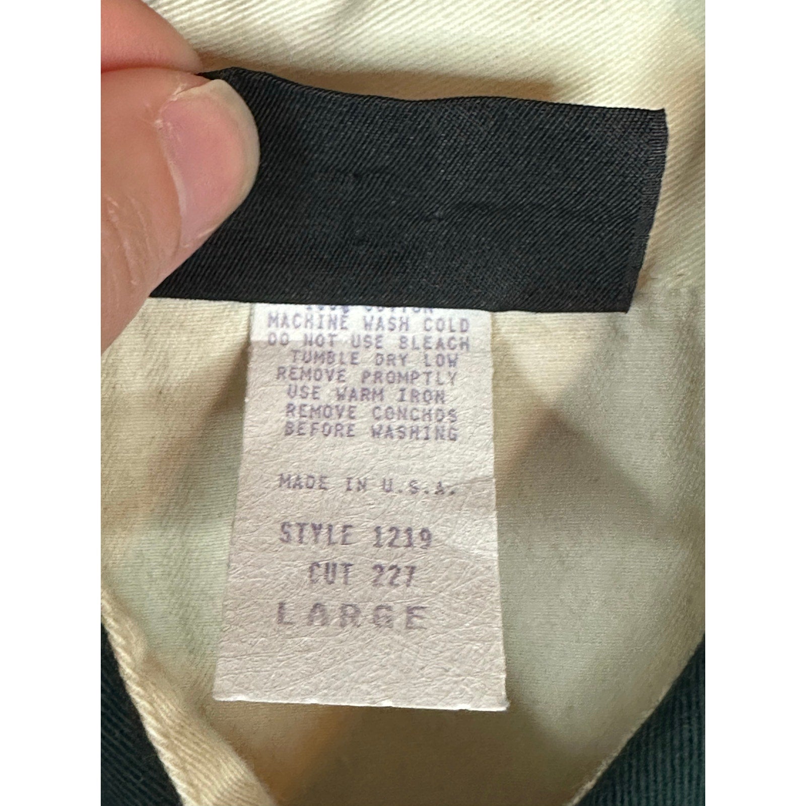 This vintage Rough Rider Western shirt features long sleeves and a button-down front, combining classic style with comfortable wear. The white and teal color scheme adds a unique touch, while the tassel details enhance its authentic Western look. Designed in a size large, it offers a relaxed fit perfect for casual outings or themed events. Durable and stylish, this shirt is a great addition to any vintage or Western-inspired wardrobe.